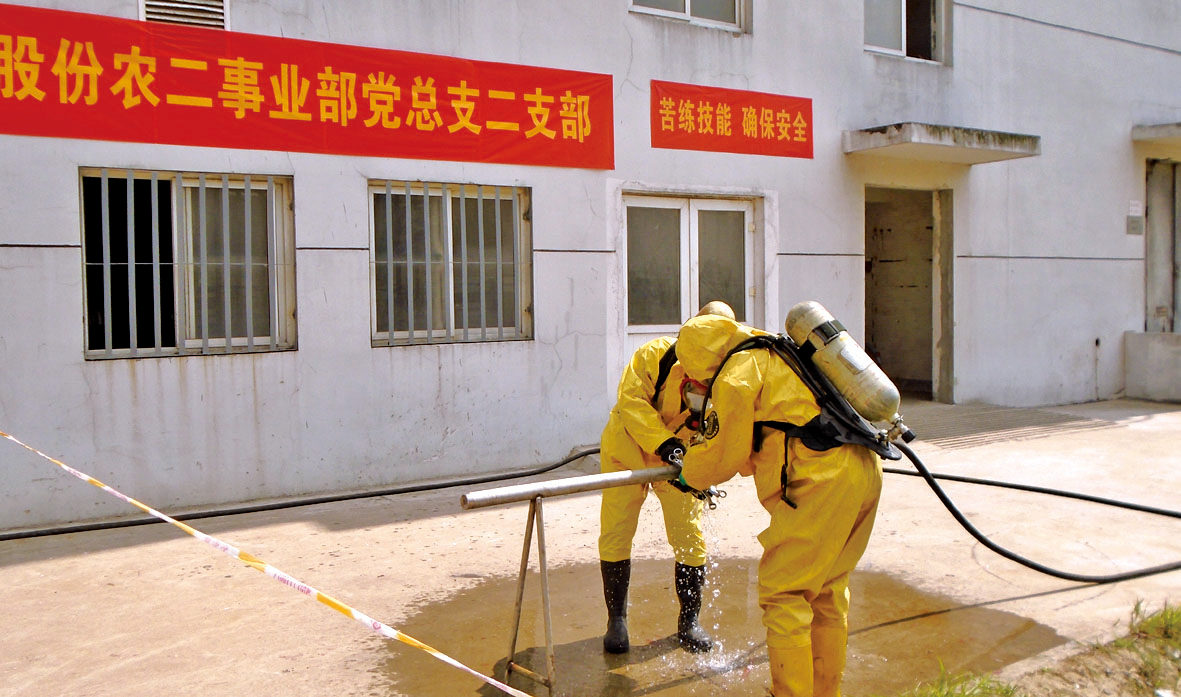 6月6日下午農(nóng)一事業(yè)部雙甘膦分廠組織氨回收送農(nóng)二事業(yè)部液氨管道泄漏預(yù)案演練,事業(yè)部總經(jīng)理孟長春擔(dān)任演練總指揮。6月19日,I草丙班與雙甘膦丙班聯(lián)合進行了液氨槽裝卸管道泄漏演練。演練前值長按照以往演練出現(xiàn)問題對原預(yù)案進行了修改,并且進行了泡沫消防炮、防化服穿戴專項訓(xùn)練。